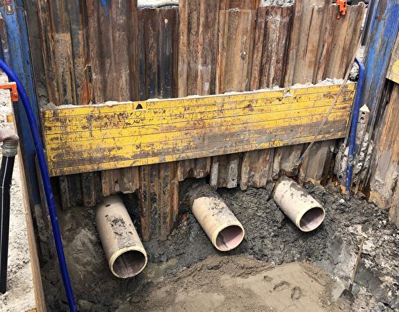 In order to be able to lay this distribution pipe, a tram line had to be crossed in the center of Nieuwegein. In short: time to drilling! In this busy urban area we carried out 3 Open Front borings with water locks of 40 meters Ø530 GRP each, including 1 casing pipe for the water pipeline. In this very busy urban area, in limited space, the drilling crew first had to create a pressing and receiving pit. Then the drilling equipment was mobilized and the drilling was realized. In addition to paying attention to the safety of yourself and your colleagues, on such projects extra care must be taken to ensure the safety of third parties such as the continuous stream of walkers, cyclists and motorists. This job, too, was successfully completed amid much scrutiny.